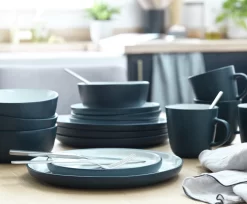 Serve up a fresh, contemporary look with our 16-piece stoneware dinner set. Delicious in white and navy, each piece has a tasteful two-tone finish. Simple and smooth, this clean crockery looks good with bright or white decor. Feast for 4? You're all set with a dinner plate, bowl, side plate and mug for everyone. Tuck in.