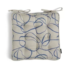 Ripples of soothing blue. Give hard chairs an instant comfy makeover with our pair of plump, tufted tie-on linen seat cushions. Deep blue swirls on a cool white sand background delivers a Mediterranean mood. Very in-vogue. We've a soft spot for these smart seats.