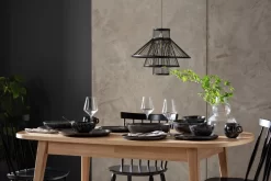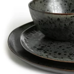 Dark and dramatic. Our stunning, black reactive glaze 12-piece dinner set is bold and beautiful. This stoneware collection includes 4 large plates, 4 side plates and 4 bowls, it's ideal for everyday use or more formal affairs. Designed to display food at its best and create a bit of drama at dinner parties. Naturally undulating edges and a matte glaze give this tactile set a hand-made feel. Microwave safe, so heat and take straight to the table. Then stack in the dishwasher and you're done. Delicious.