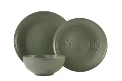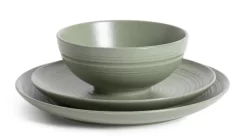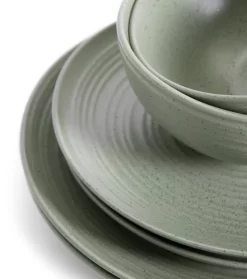 An inviting dinner service. Here's a beautiful way to lay the table for 4. In sage coloured speckled stoneware this 12-piece dinner service features a lovely ripple texture. Robust enough to be used every day, gorgeous enough to bring out for dinner parties. And the rustic reactive glaze makes each piece subtly unique. Easy going too. This green dinnerware is both dishwasher and microwave safe. There are dinner plates, bowls and side plates, so plan your menu and send out the invites.