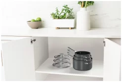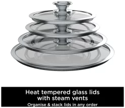 This 3-piece stacking pan set includes 16cm, 18cm and 20cm saucepans with heat tempered glass lids and cast stainless steel handles. These space-saving pans securely nest together for compact, organised storage in your kitchen cupboards or drawers, while protecting the pans' cooking surfaces.
